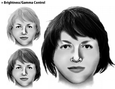 » Bildretusche mit leistungsfähigen Zeichenwerkzeugen wie Radiergummi und Airbrush. „Wischfinger“ zum Glätten und Verformen von Gesichtspartien. Stempelwerkzeug. Partielles Aufhellen/Abdunkeln.