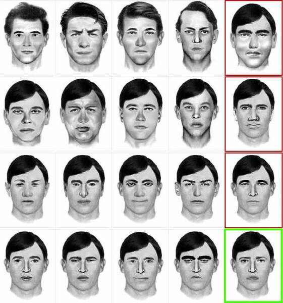 From a selection of rough and abstract portraits the witness chooses the one which comes closest to the correct facial shape. This basic portrait is furtherly processed by adding concrete facial components like hairstyle, eyes, nose, mouth etc. as long as the wanted result has been achieved.